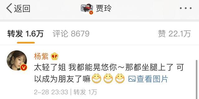 隨後賈玲發文曬出了這張錯位圖,配文:「姐是不是飄輕,都感覺不到。」楊紫第一時間回應:「太輕了,姐,我都能晃悠你,那都坐腿上了,可以成為朋友了嘛。」在《中餐廳》中,楊紫就曾表示很喜歡賈玲,是自己見過最有義氣的女演員,自己很想認識她,和她成為朋友,這次終于可以得償所願了。