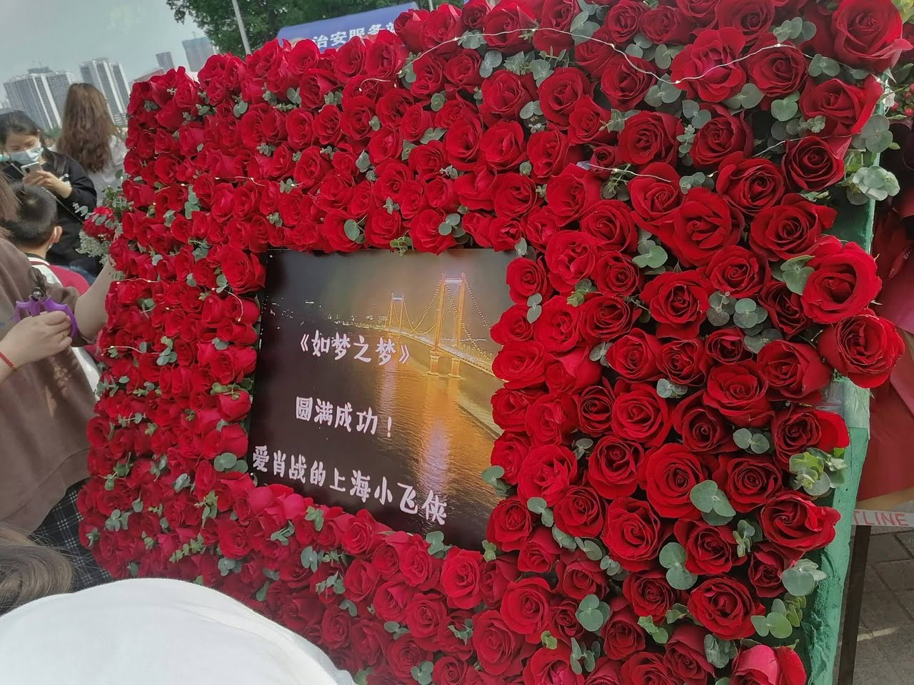 從23號一早開始,就不斷有花店開車往舞台劇公演處的琴台大劇院廣場運送粉絲購買的花籃,其中,更有多達1005朵以肖戰生日日期組成的龐大玫瑰花束。