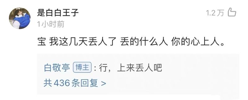 熱評第二:「寶,我這幾天丟人了,丟的什麽人?你的心上人。」小白回復:「行,上來丟人吧!」