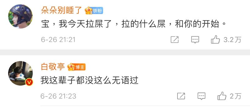 但熱評第一的絕對最厲害,直接讓小白投降!這位粉絲寫的是:「寶,我今天拉屎了,拉的什麽屎,和你的開始。」直接獲得小白回復:「我這輩子都沒這麽無語過!」哈哈哈哈哈哈!居然能讓小白無語,3.2萬讚是您應得的!!