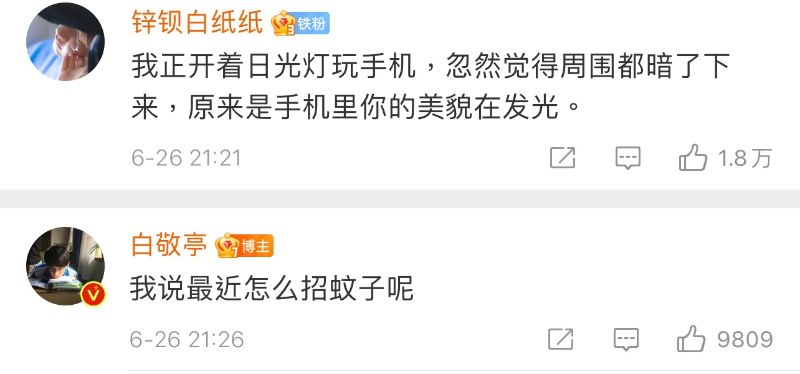 熱評第三:「我正開著日光燈玩手機,忽然覺得周圍都暗了下來,原來是手機裡你的美貌在發光。」小白回復:「我說最近怎麽招蚊子呢?」