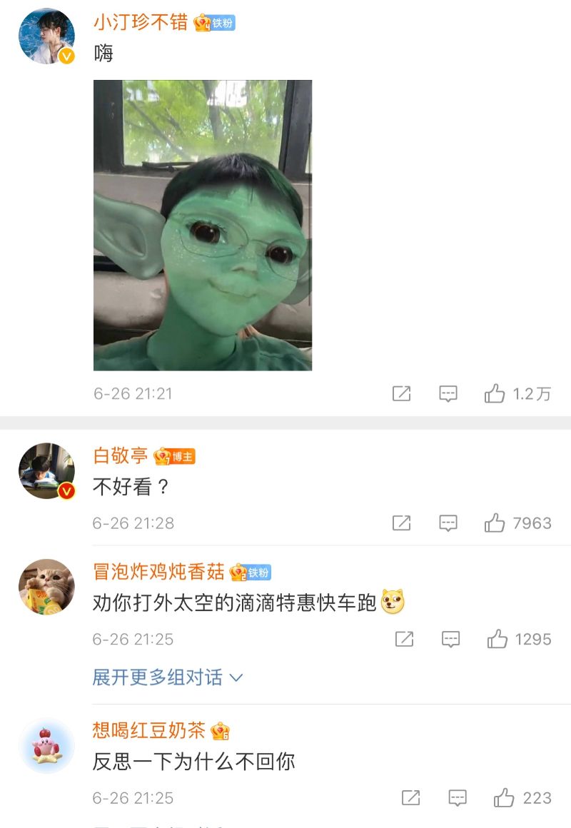 熱評第四這位粉絲,直接丟上小白濾鏡自拍,只寫了一個:「嗨!」小白反問:「不好看?」下面粉絲紛紛回懟:「勸你打外太空的滴滴特惠快車跑!」、「差點送我離開這個有白敬亭的世界!」、「反思一下為什麽不回你!」哈哈哈哈,果然飯隨正主,全都很會懟!
