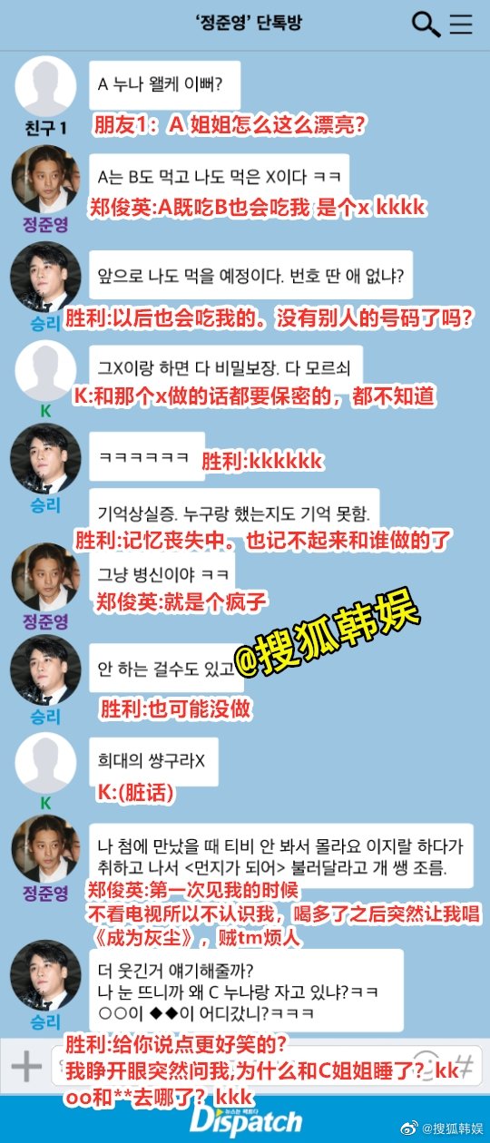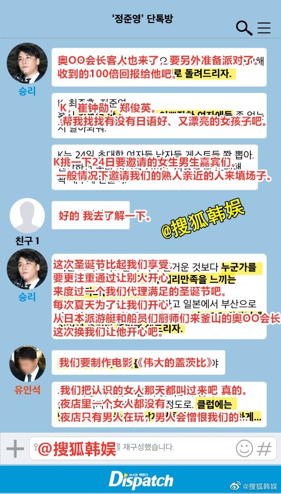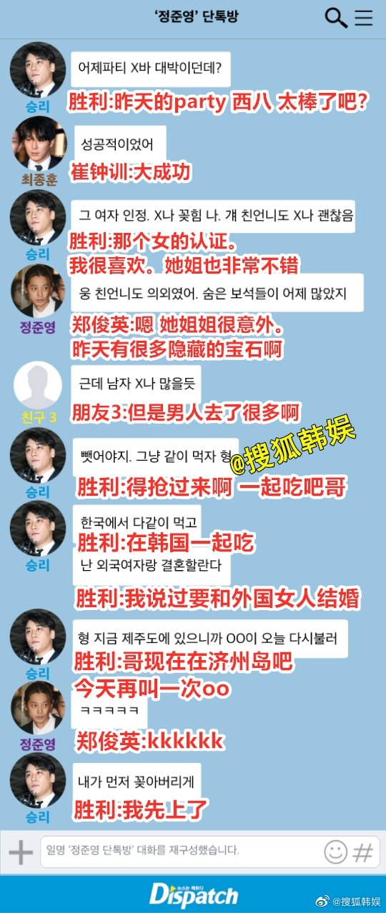 但D社在2日獨家曝光了勝利聊天室,裡面包括了與崔鍾訓鄭俊英介紹性交易的聊天記錄。勝利在聊天記錄中說到:「這次聖誕節比起我們享受,更要注重通過讓別人開心來度過一個我們代理滿足的聖誕節”」,「我們要制作電影《偉大的蓋茨比》」,「我說過要和外國女人結婚」。鄭俊英:」中國人應該會喜歡整容女吧。」完整翻譯版如下: