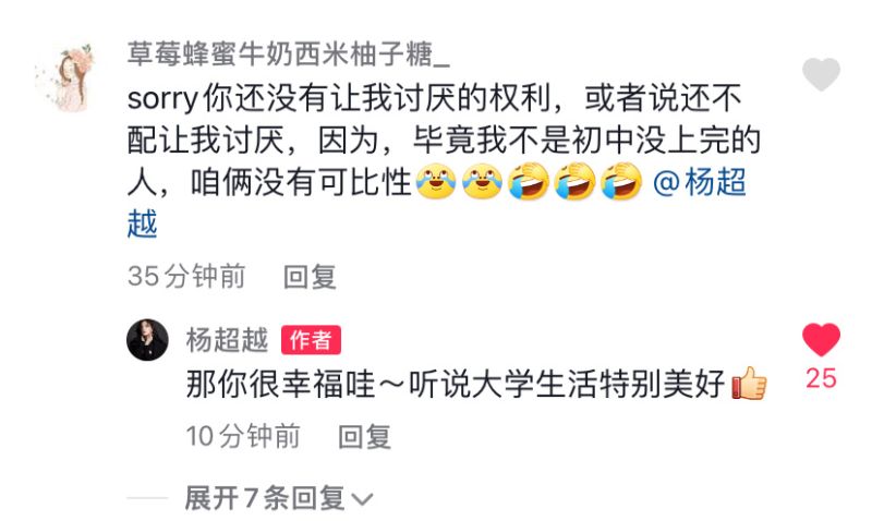 有黑子在楊超越的抖音下留言,表示:「sorry你還沒有讓我討厭的權利,或者說還不配讓我討厭,因為,畢竟我不是初中沒上完的人,咱倆沒有可比性~」明諷刺楊超越的低學歷,但沒想到居然得到楊超越的回復,表示:「那你很幸福哇~聽說大學生活特別美好👍」