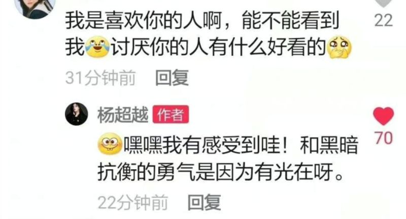 也有粉絲留言表示:「我是喜歡你的人啊,能不能看到我?討厭你的人有什麼好看的?」結果得到楊超越的回復:「嘿嘿我有感受到哇!和黑暗抗衡的勇氣是因為有光在呀。」