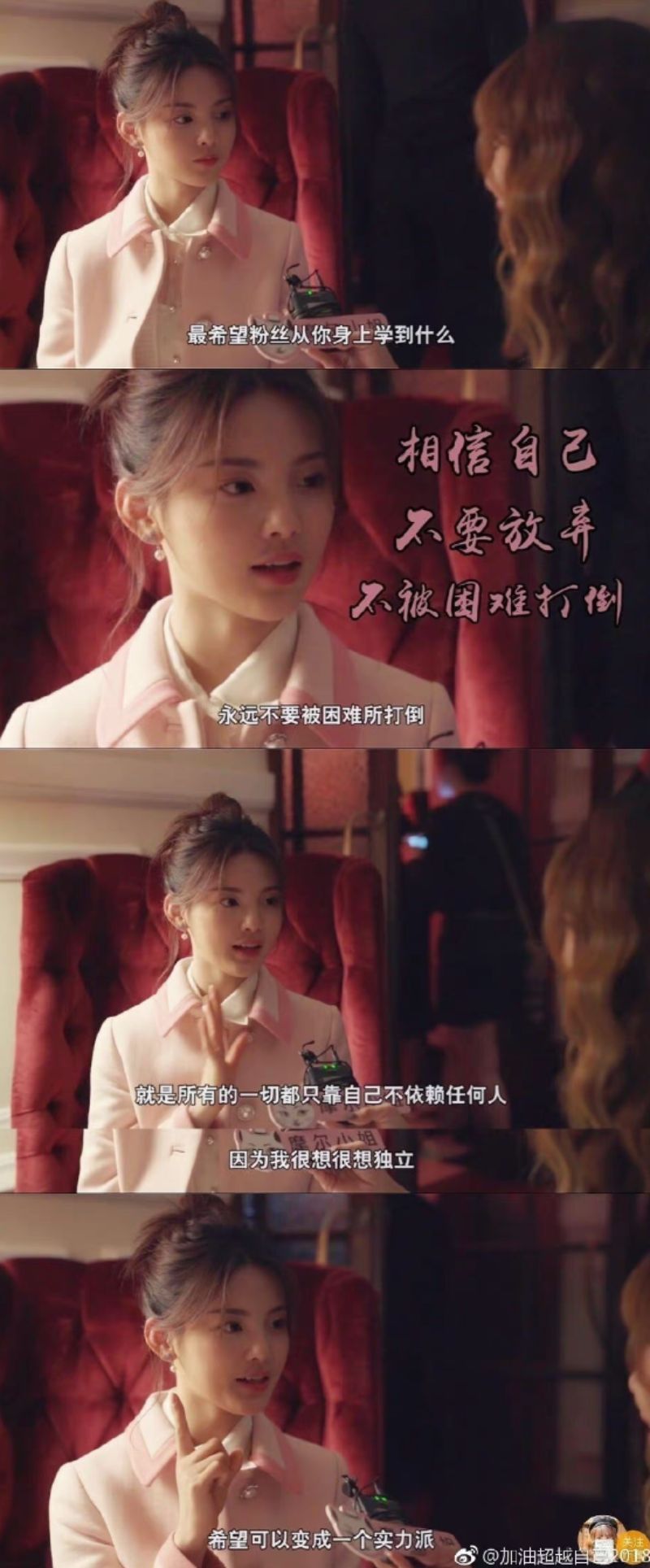 而她也說過,希望粉絲從自己身上學到:「永遠不要被困難所打倒,所有的一切都只靠自己不依賴任何人,因為我很想很想獨立,希望可以變成一個實力派。」