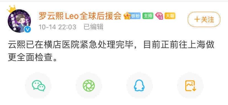 隨後羅雲熙後援會跟進報導,表示已經在橫店醫院緊急處理完畢,目前正前往上海做更全面檢查。