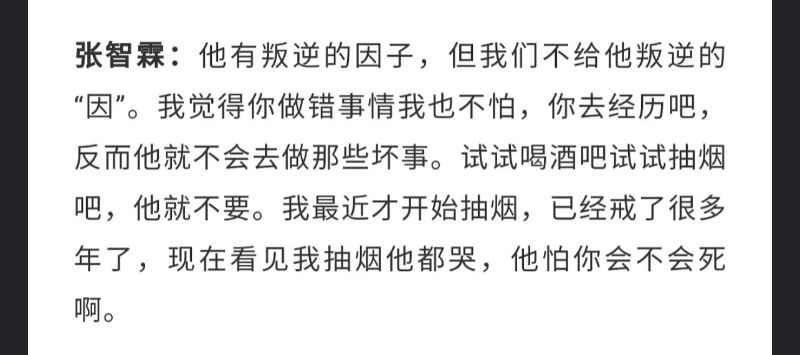 張智霖表示,有一次他們一家人和朋友去船上過夜,因為很無聊,兒子就開始玩起遊戲,玩的是一個人的一生。沒想到玩了幾盤之後,魔童就覺得人生真的很快就會結束,於是回家就哭了很久,因為很擔心爸媽會死,所以就要求張智霖絕對不能再抽了,所以張智霖就答應兒子,再也不抽了。