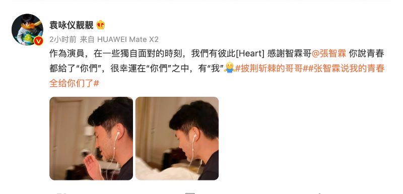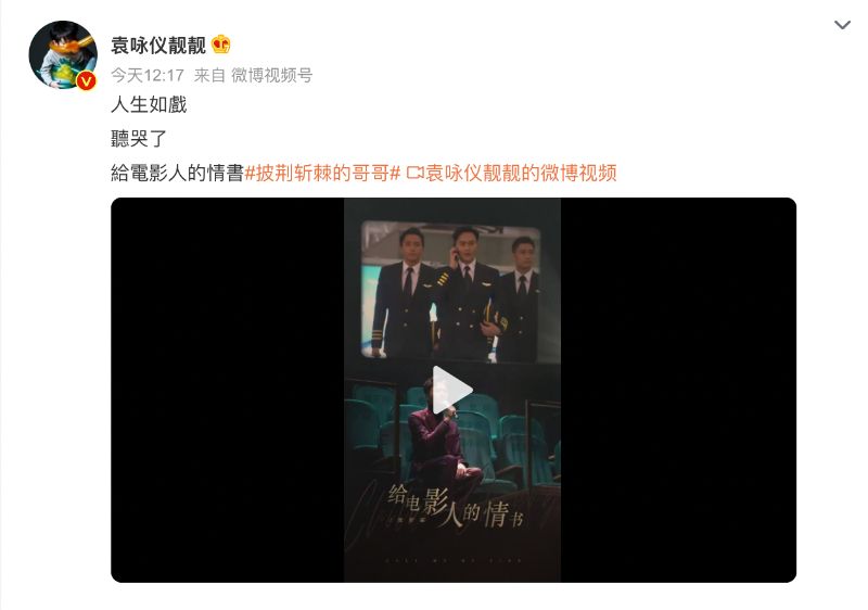 隨著節目播出,靚靚更是兩次發文為Chilam打call!第一則微博轉發了《給電影人的情書》,配文:「人生如戲,聽哭了,給電影人的情書。」