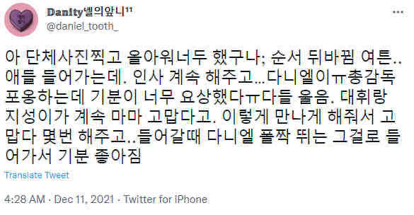 照合體照的時候還比了all i wanna do,站位發生了變化,結束以後大家都要回後台的時候,成員們也一直與粉絲打招呼告別…丹尼爾和總導演擁抱的時候心情變得很奇怪,大家都在哭…大輝和智聖一直不停地說謝謝MAMA,謝謝大家讓我們這樣見面…真的很感謝,丹尼爾最後是以蹦跳著的動作的回去的,我看到之後心情也變好了