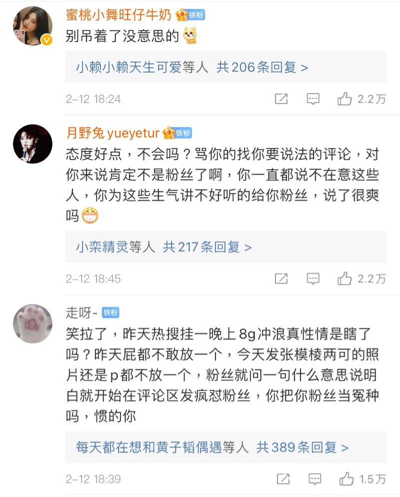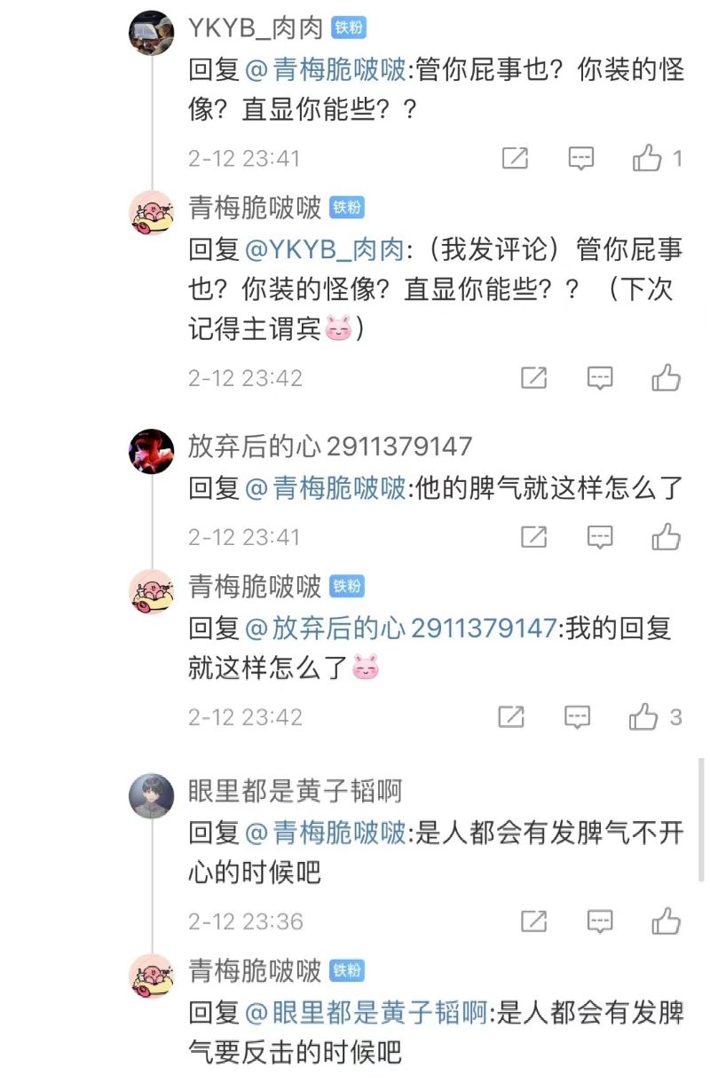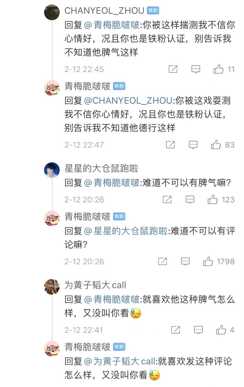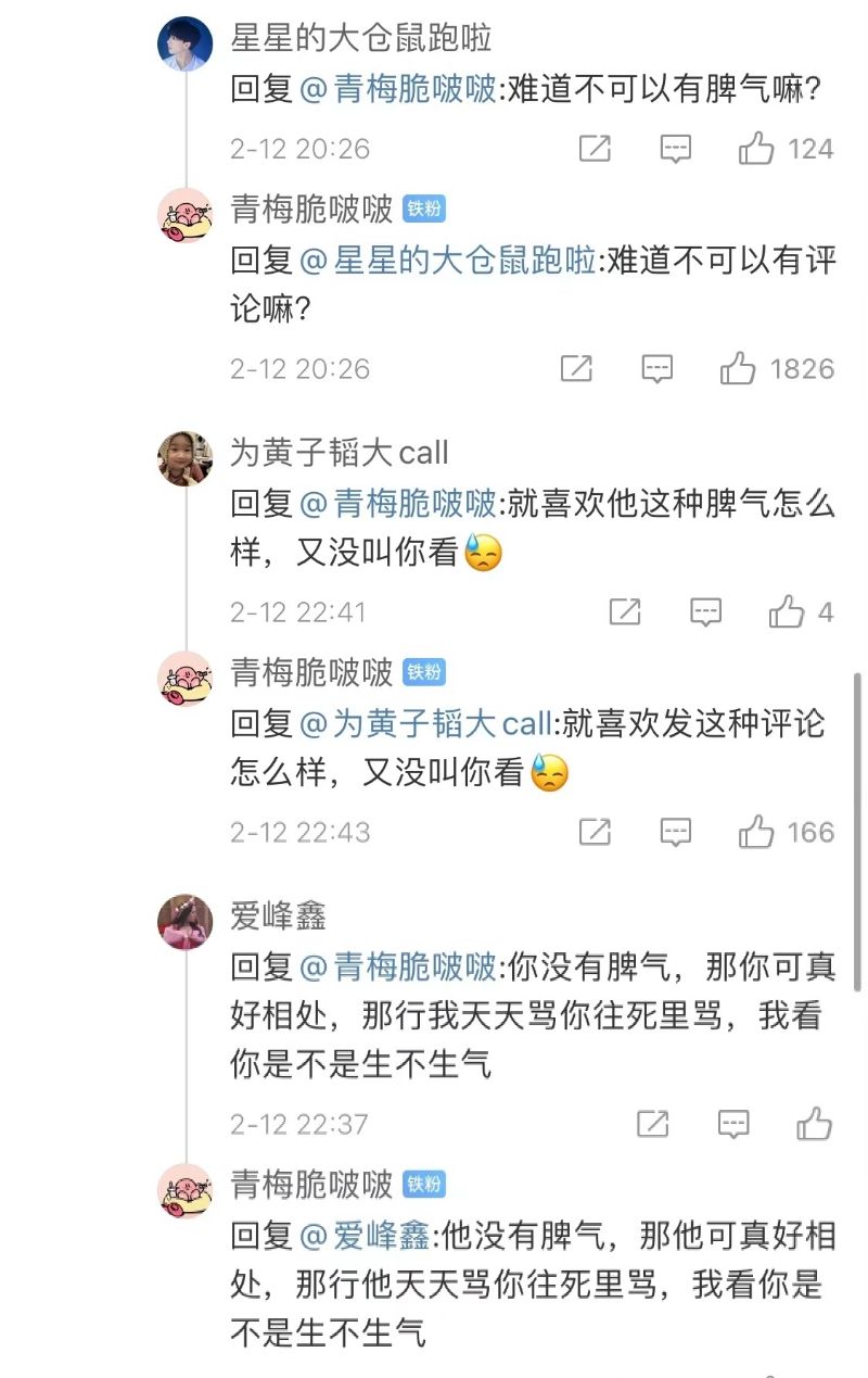 果然,每一個不管微博圖像或ID,都是黃子韜粉絲認證,而掛在後面的「鐵粉」也不是隨便可以得到的啊!但這麼多鐵粉中,不得不說熱評第一直接懟黃子韜:「哈哈哈哈哈哈你還脾氣挺大啊」,而得到了近10萬點讚的鐵粉「青梅脆波波」,真的擁有一人可抵萬人的懟人技術啊!其他粉絲在她的留言下回懟她,她完全不慌不亂充分示範了何謂「教科書」級別的對線技術,這就來學習一番👇