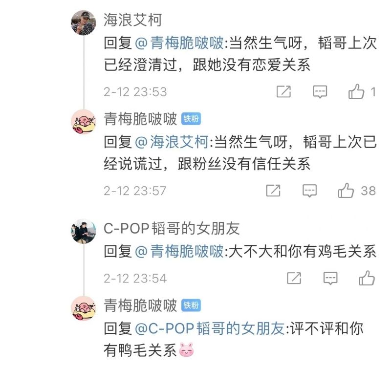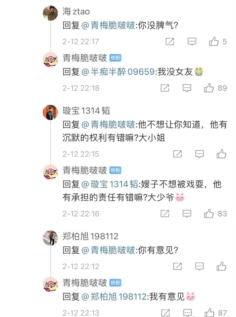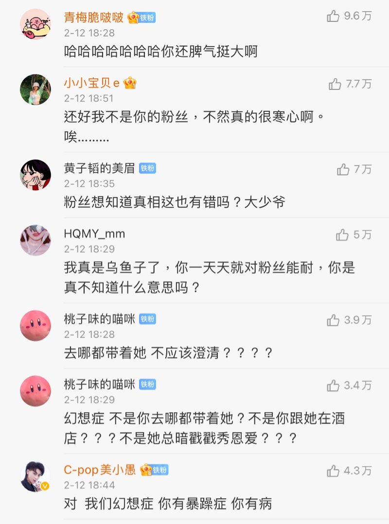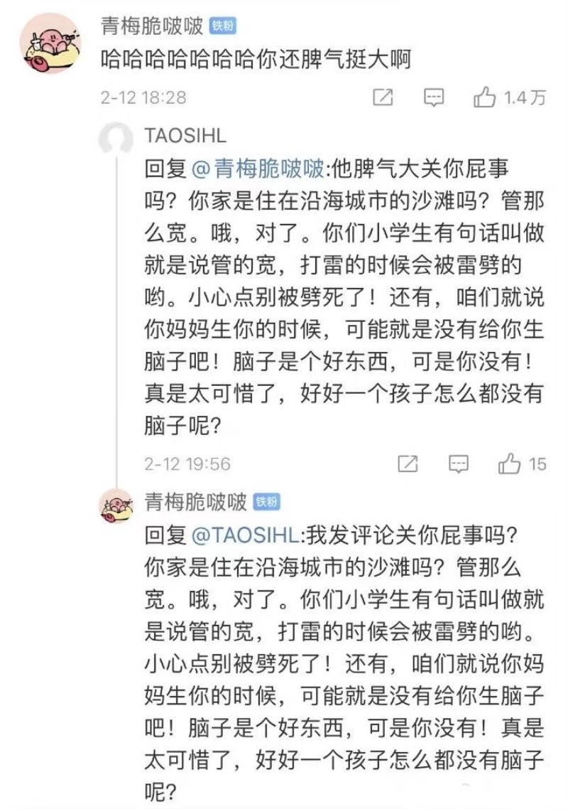 果然,每一個不管微博圖像或ID,都是黃子韜粉絲認證,而掛在後面的「鐵粉」也不是隨便可以得到的啊!但這麼多鐵粉中,不得不說熱評第一直接懟黃子韜:「哈哈哈哈哈哈你還脾氣挺大啊」,而得到了近10萬點讚的鐵粉「青梅脆波波」,真的擁有一人可抵萬人的懟人技術啊!其他粉絲在她的留言下回懟她,她完全不慌不亂充分示範了何謂「教科書」級別的對線技術,這就來學習一番👇
