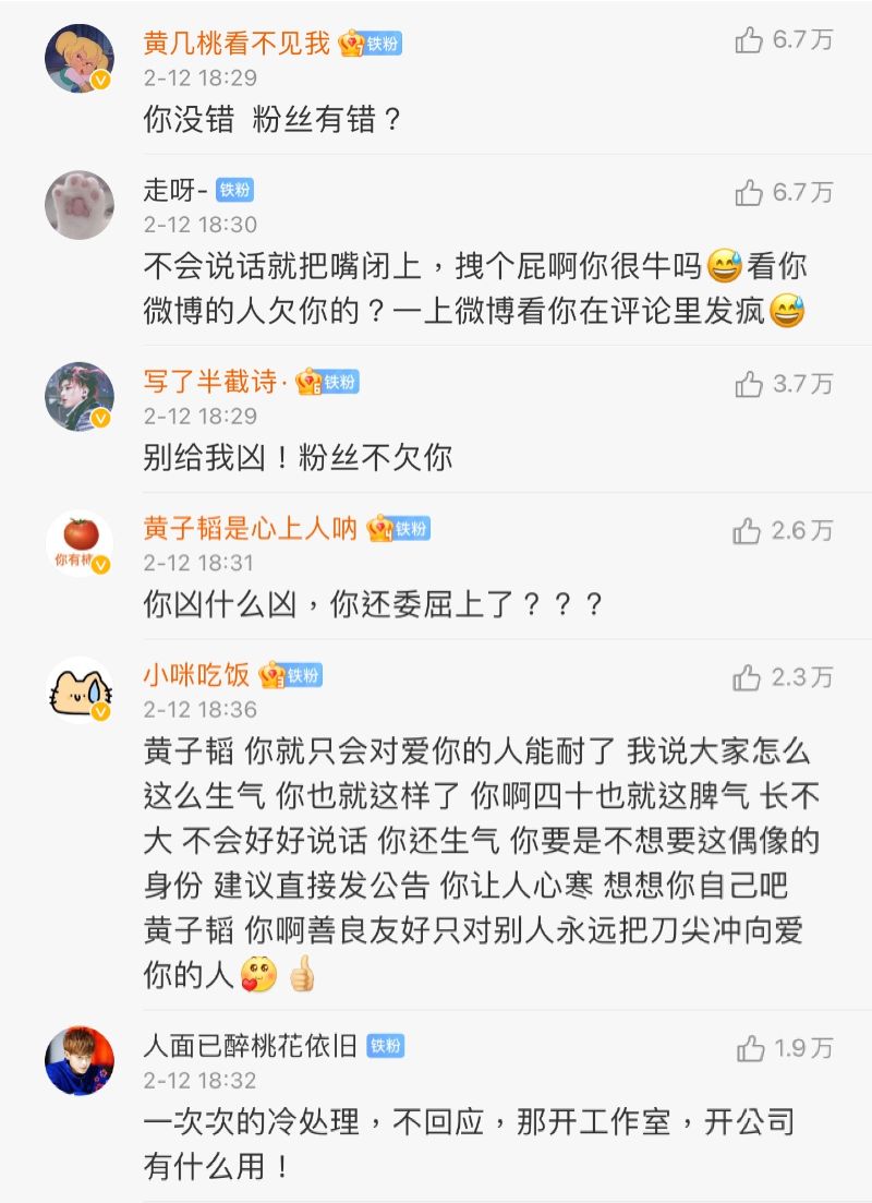這也來看看,經過了快一天,黃子韜這則微博評論區熱評,幾乎都是鐵粉留言,每一條都在懟黃子韜👇