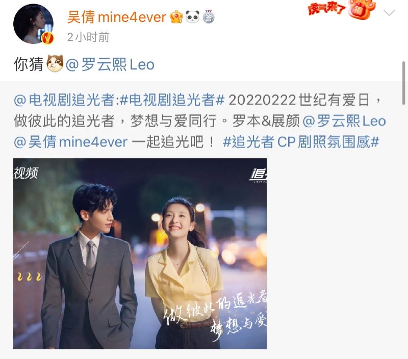 隨著官博公開新劇照,羅雲熙也發博艾特吳倩,問:「什麼事這麼開心?」