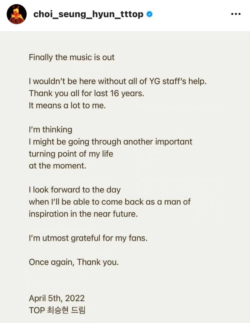 隨後,TOP更新了自己的INS,上傳了長文公開告別,疑似回應YG官網刪除自己照片一事👇