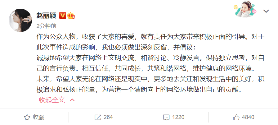 隨後由於涉及拉踩引戰等飯圈文化,趙麗穎後援會、大粉賬號,趙麗穎工作室等都被相繼禁言,而趙麗穎本身也出面道歉,被稱為「823事件」。