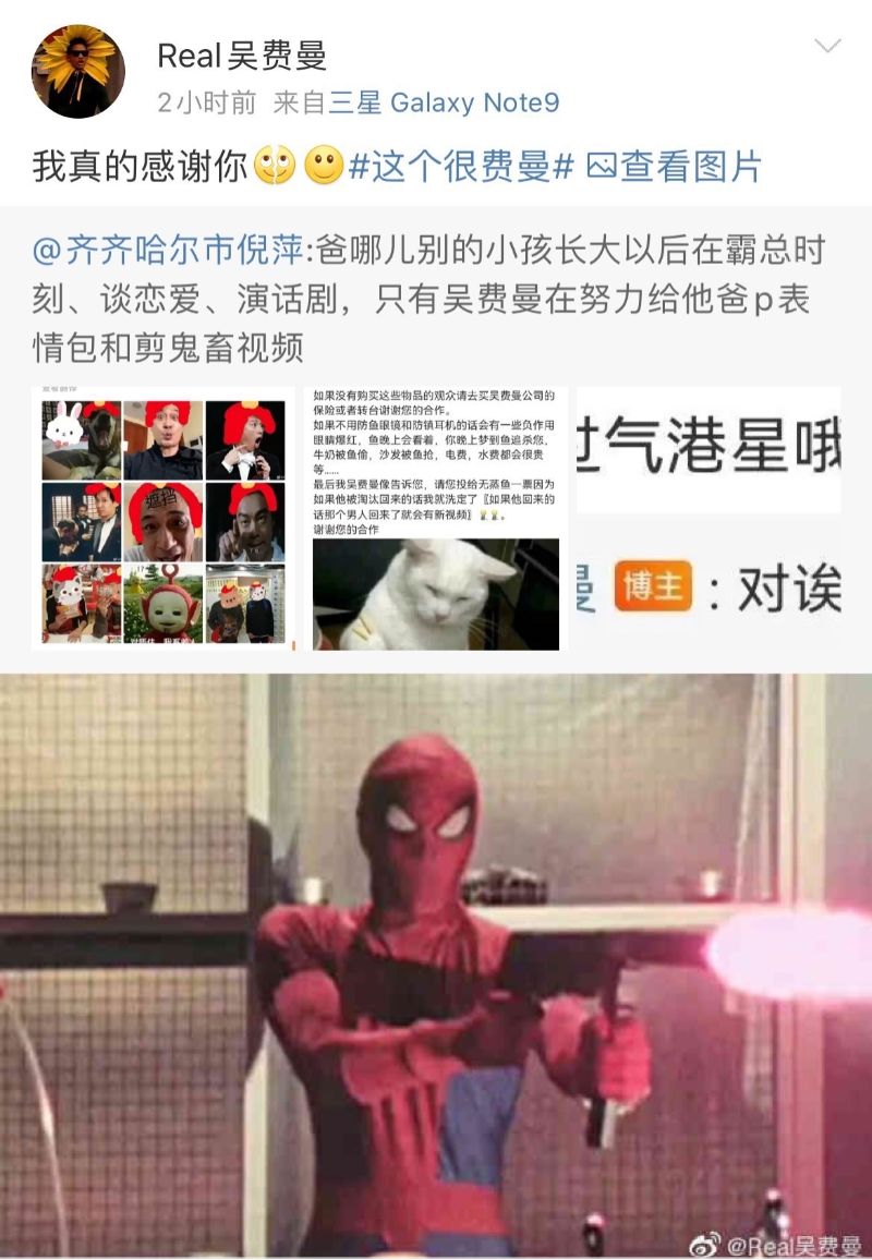 沒想到同樣是14歲的吳費曼,也被網友點名調侃啦!是噠,費曼轉發了一個網友發帖,表示:「我真的感謝你」,並附上了奧特曼的表情梗圖!該網友的原帖寫著:「爸哪兒別的小孩長大以後在霸總時刻、談戀愛、演話劇,只有吳費曼在努力給他爸p表情包和剪鬼畜視頻 !」