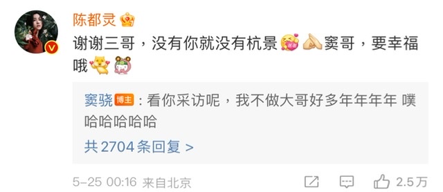雖然劇迷吵得轟轟烈烈,女主陳都靈倒是很大方,直接在竇驍微博留言,男女主這不就互動啦!