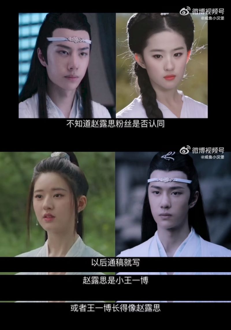 接著,再次點名趙露思,說趙露思出道時曾打著“小劉亦菲”的稱號,但是拿了劉亦菲在《夢華錄》中的截圖,直接對比《且試》中的趙露思👇 最後還要拉踩了《風起洛陽》中的王一博,表示每次戲中夸這些人,自己就要在熒幕外笑一次👇