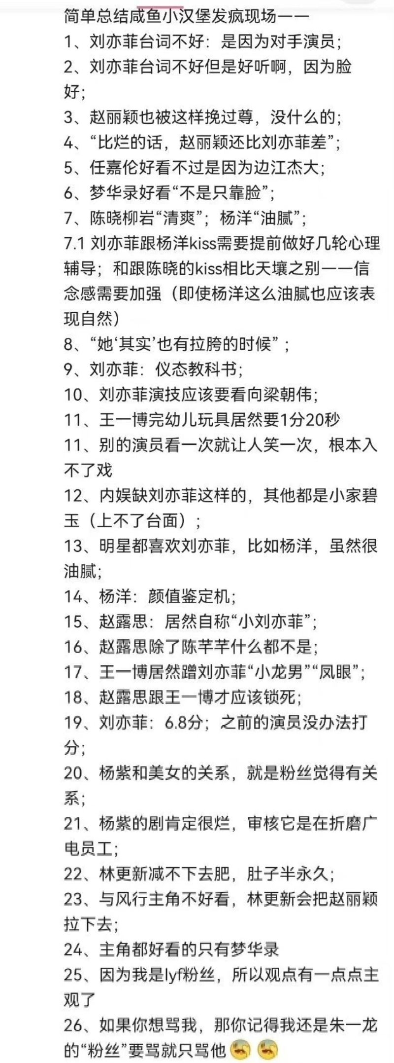 就,劉亦菲粉絲現在表示此Up主不是真的劉亦菲粉,但整個內娛現在基本上槍口一致,而「鹹魚小漢堡」也刪除了這則視頻。就…為了捧自家正主拉踩百家,真的是…