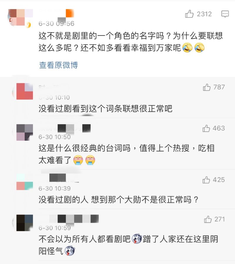 也有網友認為這只是劇中角色名字,不需要聯想太多。不過隨後被不少網友反懟,表示沒看過《幸福到萬家》的話,會出現「你和大勛=楊冪和魏大勛」的聯想十分正常!