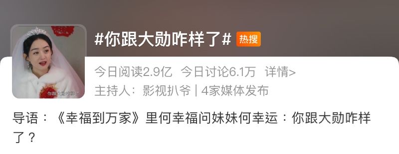 但沒想到該劇播出之後,第一個上的卻是個黑熱搜,熱搜詞是「你和大勛咋樣了?」???是噠,這是劇中趙麗穎飾演的何幸福,詢問妹妹何幸運和其男友的感情狀態,但沒想到這句台詞居然超出圈,直接上了熱搜榜!