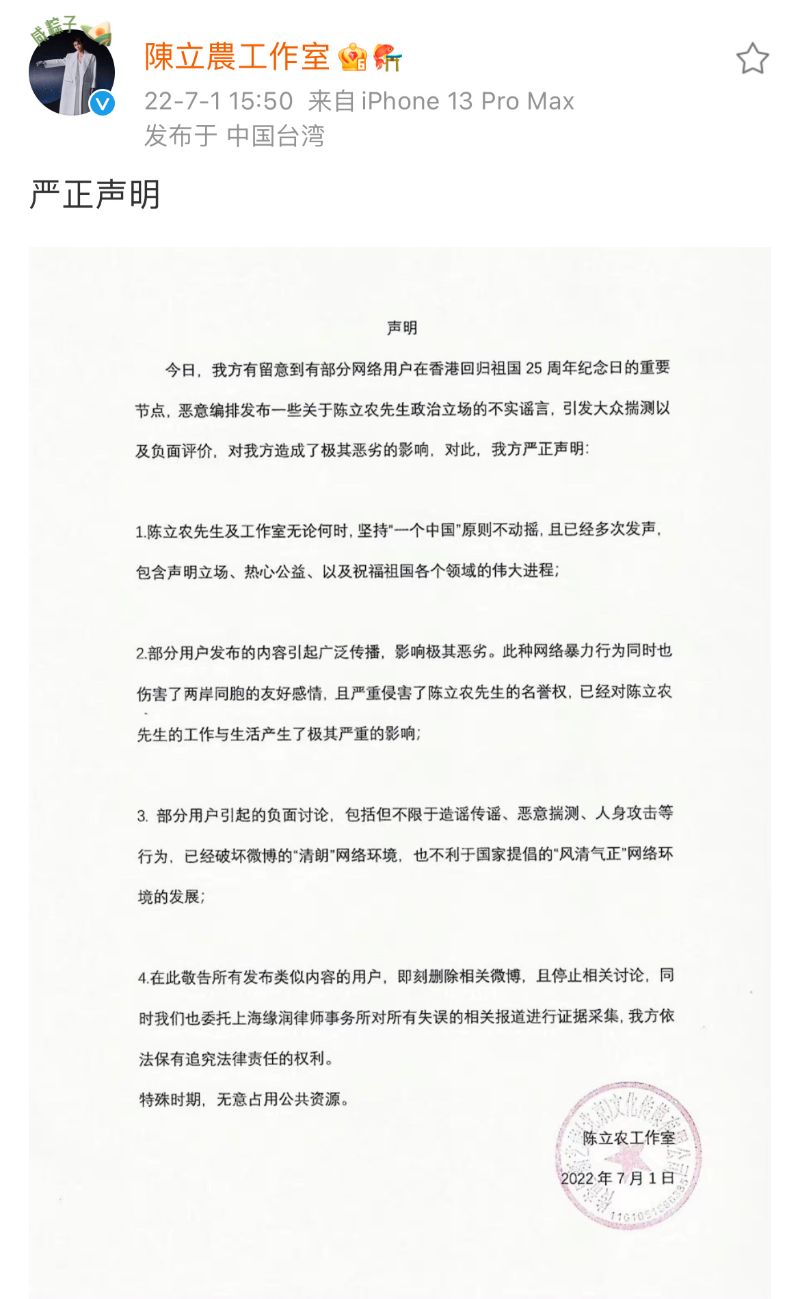 隨著“陳立農 雙面圖”被扒,不少網友紛紛辱罵他的政治立場,而工作室則速速發聲明,強調這些針對陳立農政治立場的,都是不實謠言,並強調“堅持一個中國”的原則。