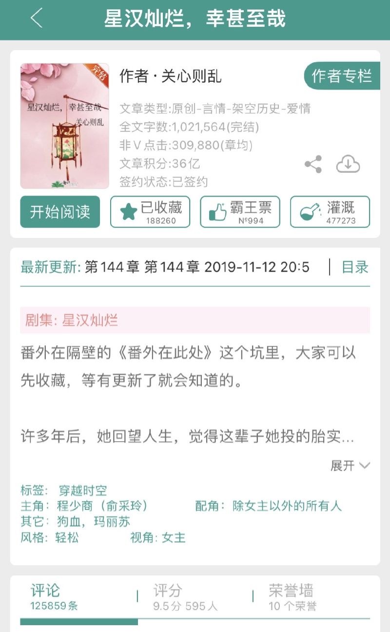 另外,網友也發現了趙露思和《星漢燦爛》原著之間的神奇緣分…這裡科普一下,《星漢燦爛》改編自曾寫出《知否知否應是綠肥紅瘦》的關心則亂筆下,在開播之前,這部小說收藏人數9萬人,開播幾天之後,收藏人數已經翻倍到18萬,電視劇的影響力可見一斑👇