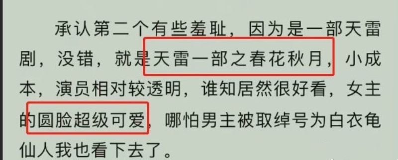 當中提到自己正在追一部叫《春花秋月》的“雷劇”,當中特別點名圓臉的女主超級可愛👇