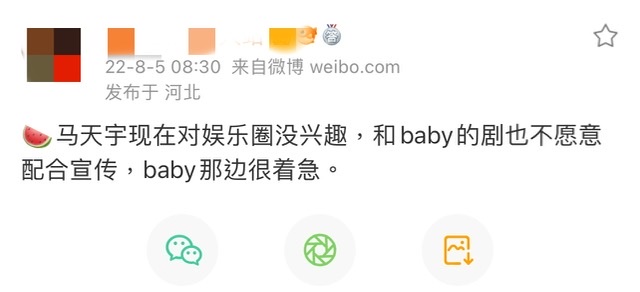 5日,就有營銷號發文,表示馬天宇現在對娛樂圈沒興趣,和baby的新劇也不願意配合宣傳,baby那邊很著急,暗示《塵緣》不能定檔和馬天宇有關。