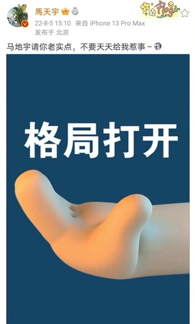 隨後,馬天宇發文:「馬地宇請你老實點,不要天天給我惹事~」並配了一張格局打開的圖片,果然是玩梗第一人啊!