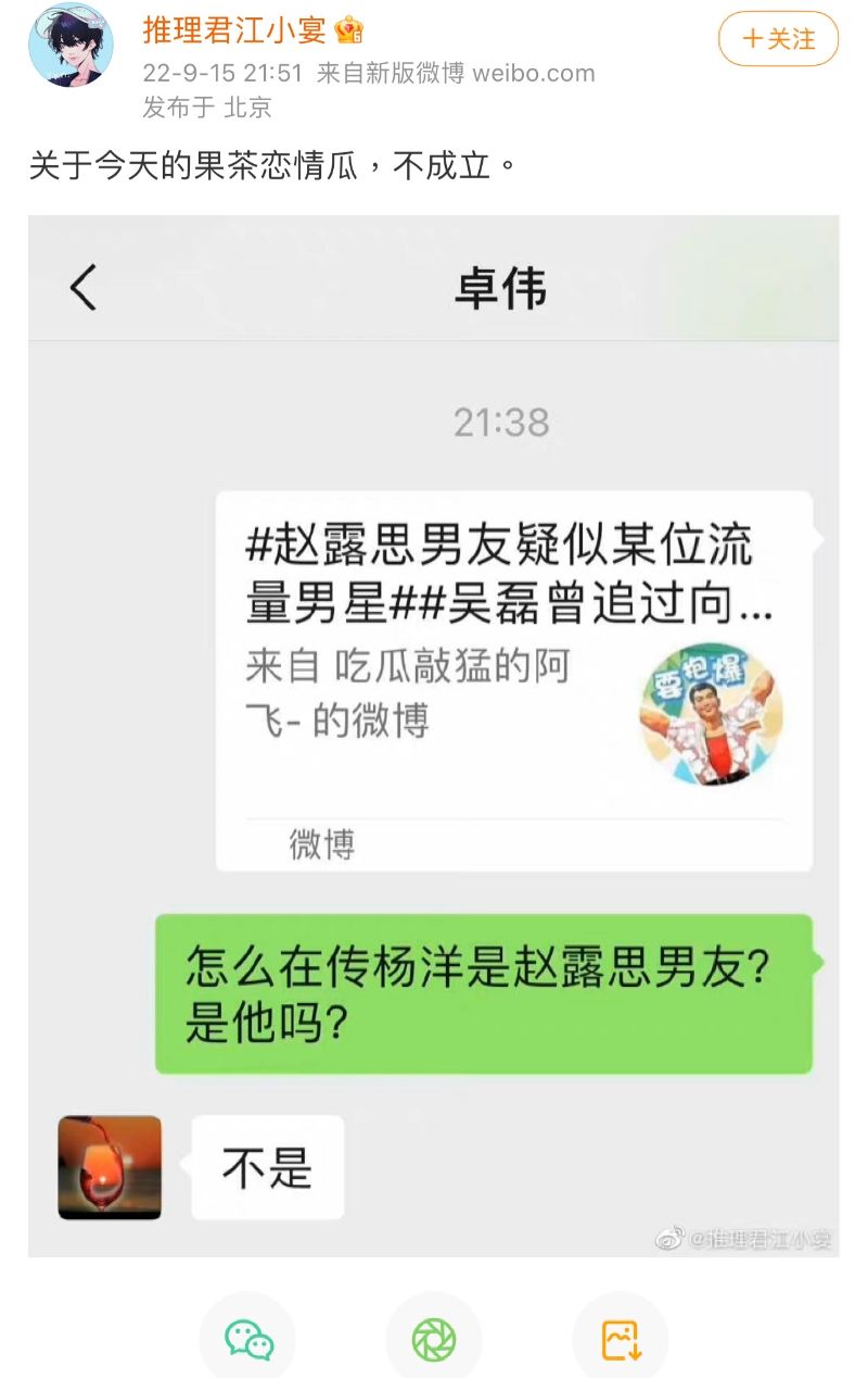 15號晚間,另一個狗仔出來打假,放出了和「中國第一狗仔」卓偉的聊天截圖,表示趙露思男友不是楊洋👇