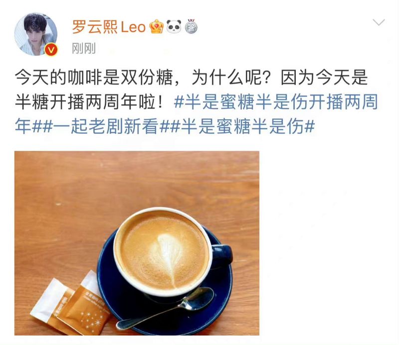 配合開播2週年,我們的袁帥也發文慶祝啦!放出了一杯咖啡,表示「今天的咖啡是雙份糖,為什麼呢?因為今天是半糖開播兩週年啦!」