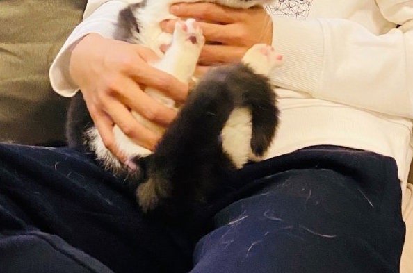 戰戰不愧是鏟屎官,擼貓動作十分標準,看堅果舒服的翹起小腳腳超可愛!