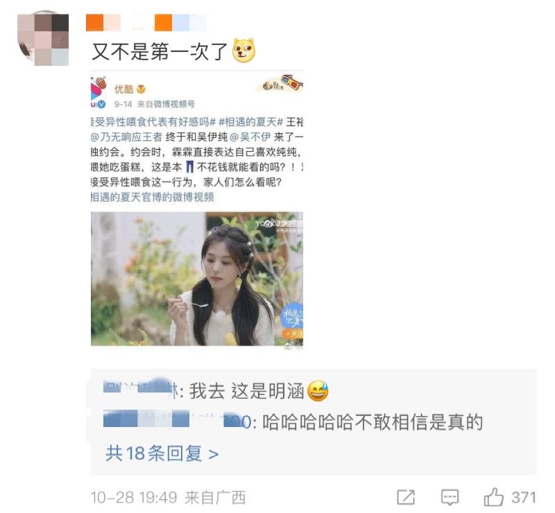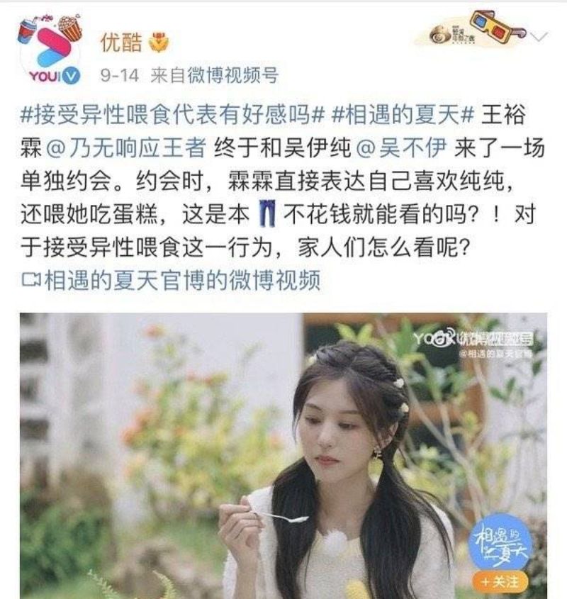 早在9月中,優酷官微就曾發了“接受異性餵食代表有好感嗎?”的話題👇