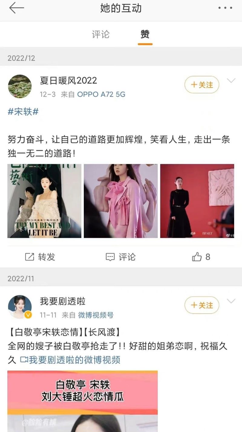沒想到都過了一個月,居然還有新發現!沒錯,網友發現宋軼的媽媽,居然還點讚過「白敬亭宋軼」戀情的相關貼文~先來看看宋軼媽媽的微博號,參與的超話都和女兒相關👇