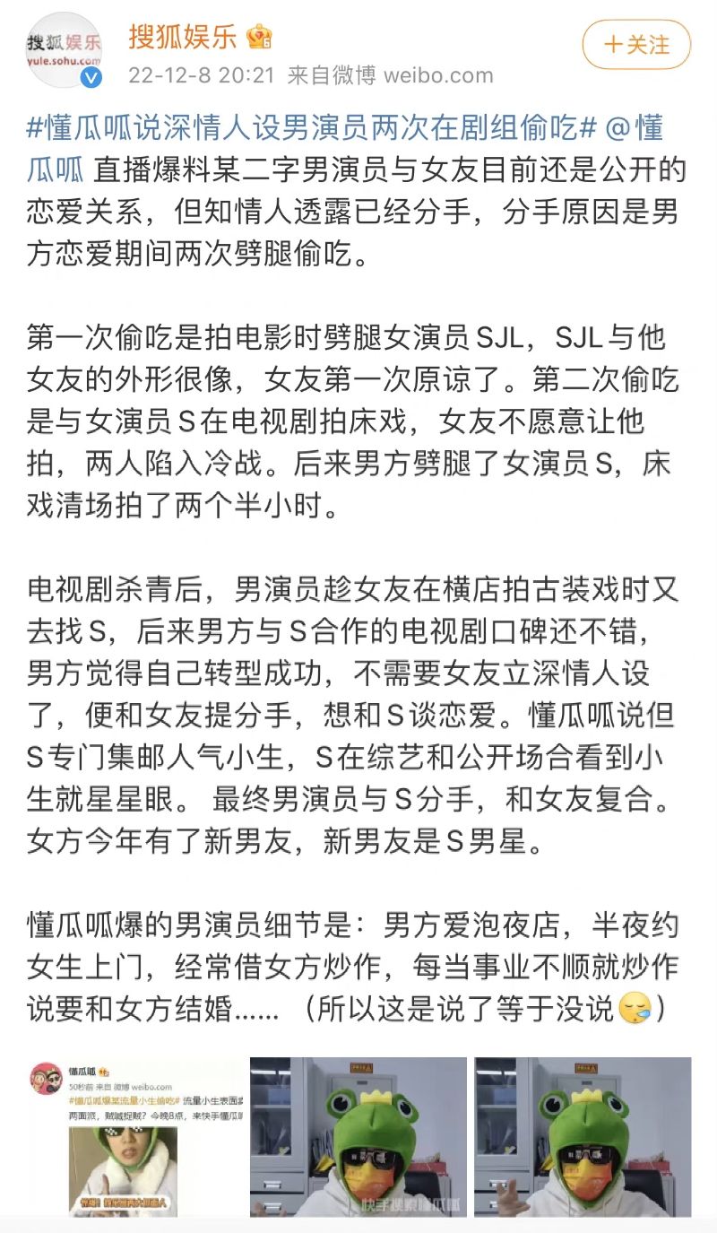 這就來看看,8號晚上有狗仔爆料,表示有深情人設男演員兩次在劇組偷吃,當中提到是「二字」男演員,而目前和女友還是公開的戀愛關係。不過狗仔爆料兩人其實已經分手,至於分手原因是因為男方戀愛期間,兩次劈腿偷吃。