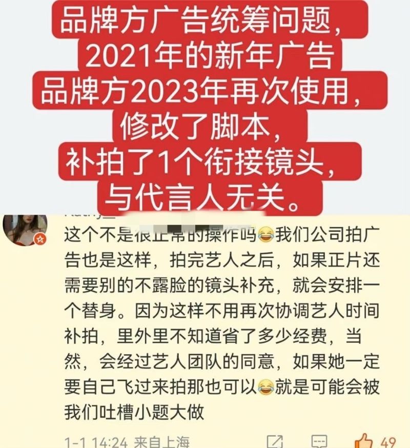 甚至有網友扒出,熱巴代言的廣告,在最新的開年視頻中,背影居然用了替身👇