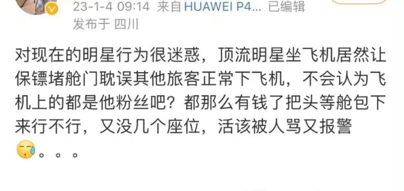 事件的開始在於有網友在4號發文,表示有頂流明星坐飛機時,居然讓保鏢堵艙門耽誤其他旅客正常下飛機,還提到因此被人罵又被報警👇