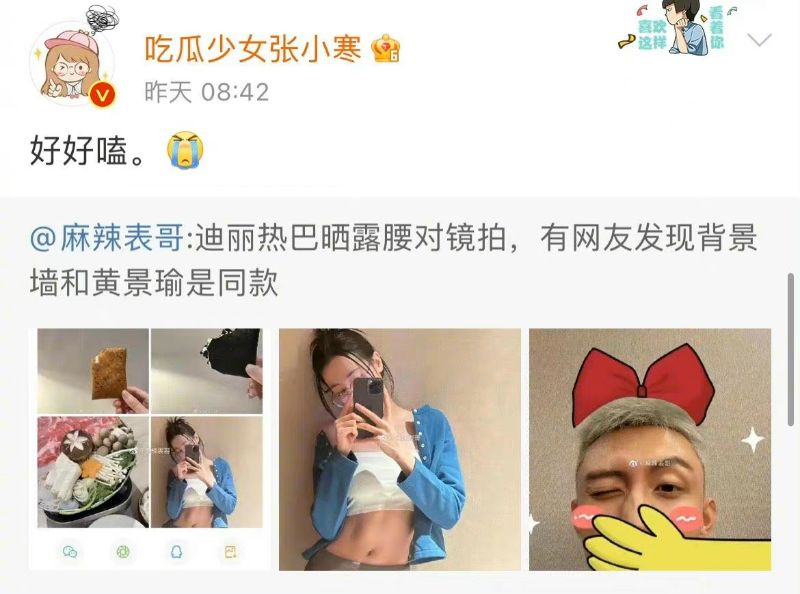 隨後,狗仔張小寒轉發了一則貼文,當中指出熱巴拍照的背景,和黃景瑜是同款👇