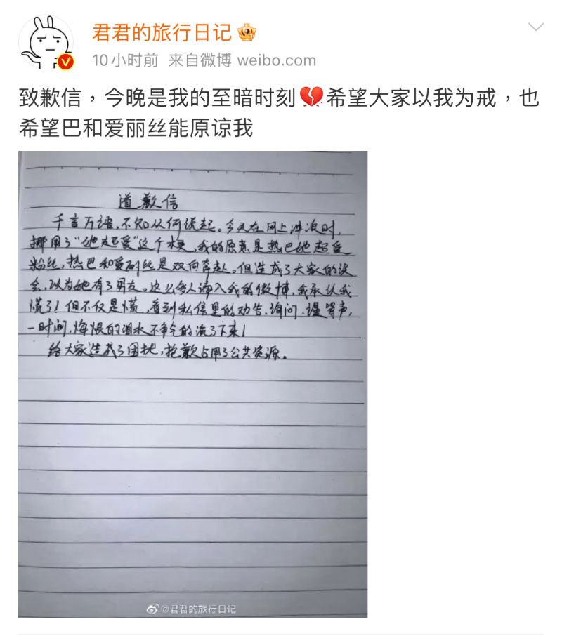 而爆料解約「她超愛」梗的瓜主也發了道歉信👇