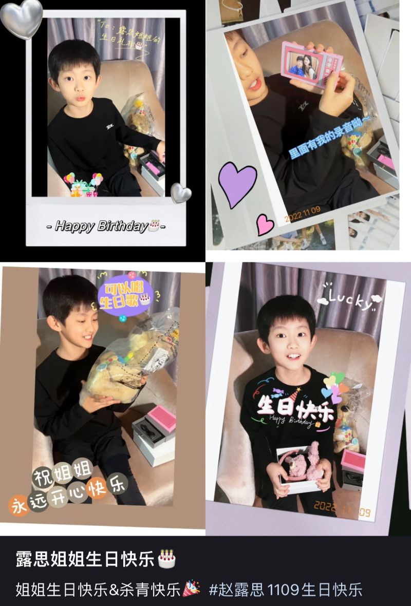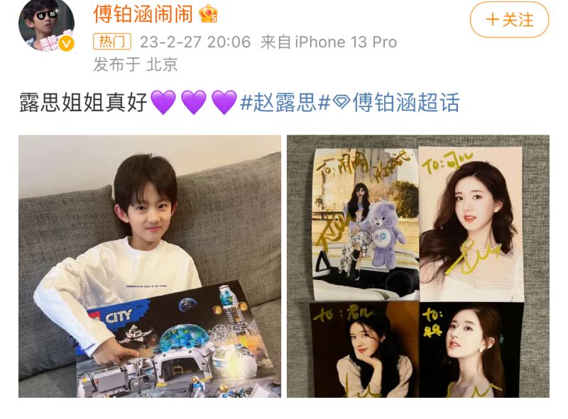 而最近趙露思被黑的天昏地暗的,結果他也發文,公開了趙露思送給自己的禮物,喊話:「露思姐姐真好!」更特別送上了代表露思應援色的紫色愛心💜💜💜💜💜💜💜👇