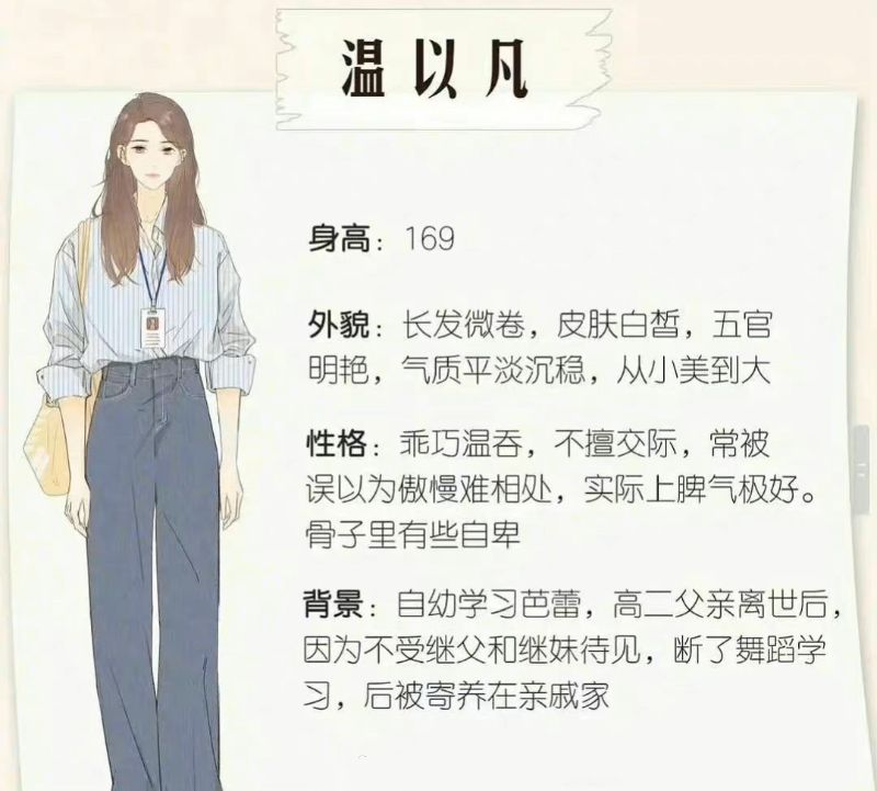 至於我們的女主溫以凡呢?也來看看,被稱為最沒有脾氣的溫霜降,長相明艷動人,氣質平淡沉穩,性格乖巧溫吞,不善交際,常被誤認為難相處,實際上脾氣極好,而且骨子裡有點自卑👇