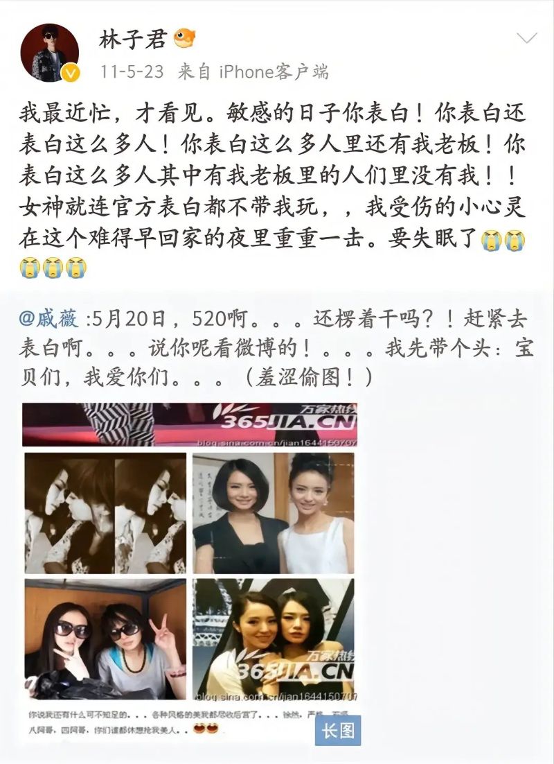不過林子君最出圈的,還是和戚薇的一段感情。是噠,從2011年開始,兩人就互動很頻繁。她們一起上過封面雜志,參加過節目,戚薇拍戲,林子君也經常到片場探班。