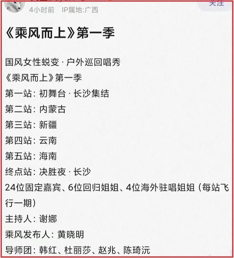 先來看看網傳這一季的節目,主打「國風女性蛻變 • 戶外巡回唱秀」,一共會有6個舞台,分別是👇