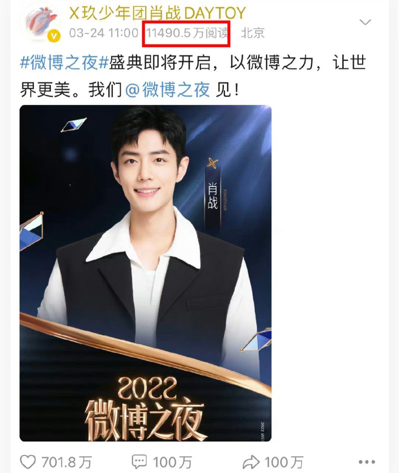 至於男藝人的頂流,真的實至名歸,那就是我們的肖戰!!!來看看他的微博數據,是連廣告貼都可以破億的誇張程度!