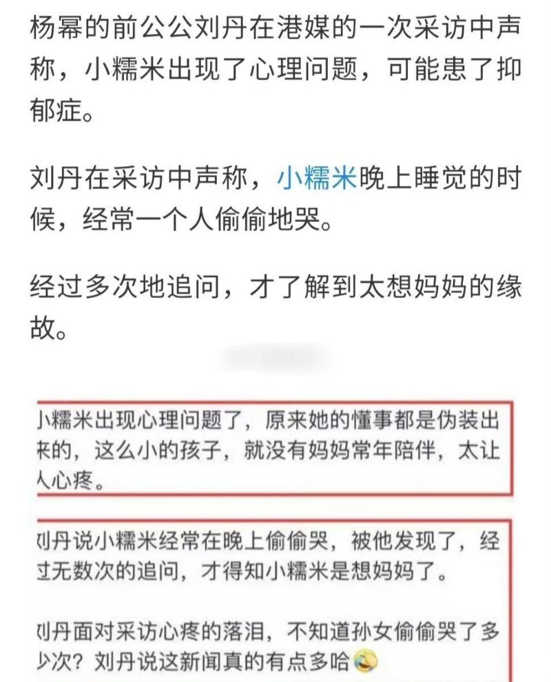 這個訪問意外還讓楊冪處於風口浪尖,認為她「會生不會養」,但沒想到有內地媒體報道,表示前公公,也就是小糯米的爺爺劉丹,在近期的訪問中聲稱小糯米出現了心理問題,可能患了抑鬱症。根據報道,劉丹表示小糯米晚上睡覺的時候,經常一個人偷偷滴哭,追問之下才知道是因為思念媽媽。