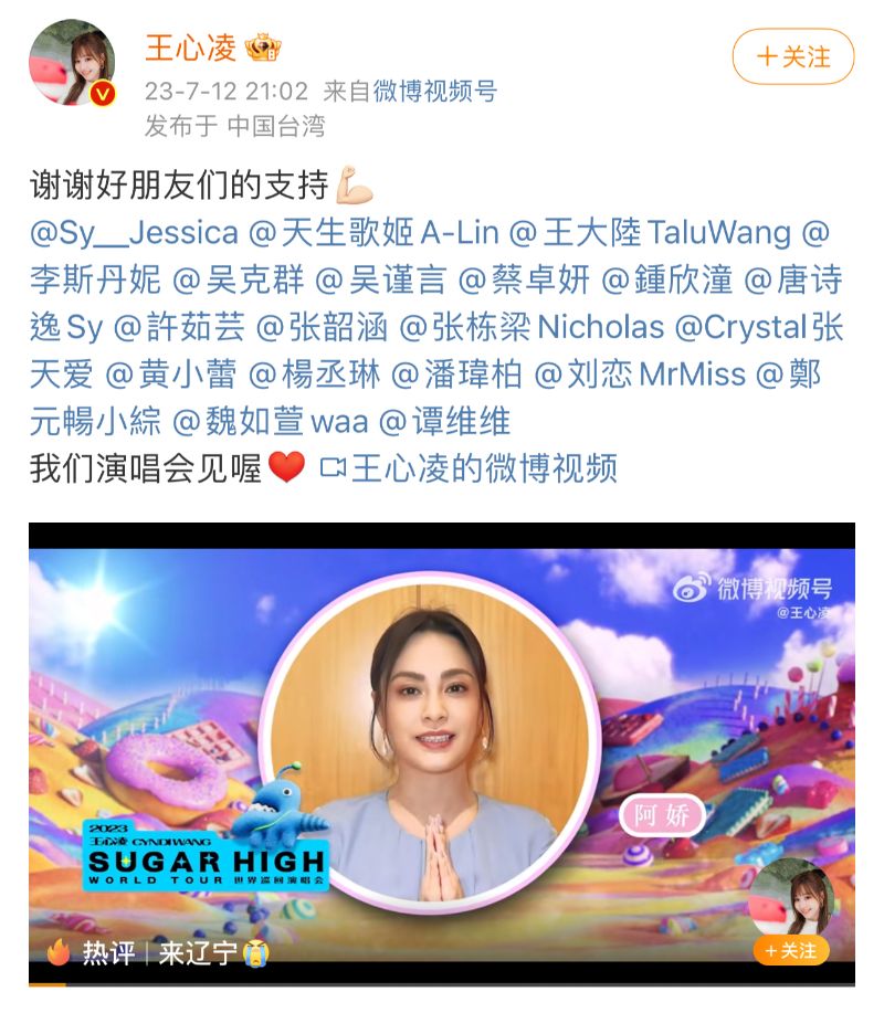 而配合演唱會,王心凌也找來了圈內好友錄製祝福VCR,包括了一起參加浪姐3的阿嬌、阿Sa、吳謹言等,果然是人脈王!