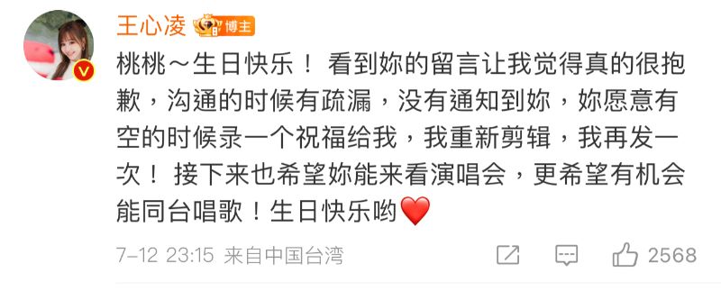 面對我們桃桃這麽直球的留言,王心凌的回覆引來網友們一片讚好!來看看Cyndi怎麼說:「桃桃~生日快樂!看到妳的留言讓我覺得真的很抱歉,溝通的時候有疏漏,沒有通知到妳,妳願意有空的時候錄一個祝福給我,我重新剪輯,我再發一次!接下來也希望妳能來看演唱會,更希望有機會能同台唱歌!生日快樂喲❤️」