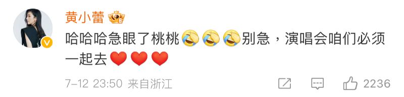 而同樣是浪姐3的黃小蕾也留言,表示:「哈哈哈急眼了桃桃!別急,演唱會咱們必須一起去❤️❤️❤️」
